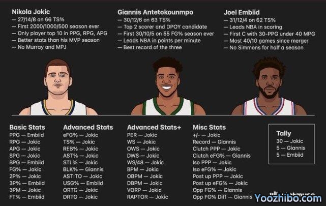 约基奇本赛季出战74场常规赛,场均出战33.5分钟,贡献27.1分13.8篮板7.9助攻1.5抢断0.9盖帽。他的得分和篮板均创职业生涯新高。约基奇常规赛共得到2004分1019篮板584助攻,他成为NBA历史上第一位单赛季至少得到2000分1000篮板500助攻的球员。此前有美媒晒出约基奇、恩比德和字母哥在40项基础数据和高阶数据上的对比,结果约基奇赢了其中30项,恩比德和字母哥各赢了5项。