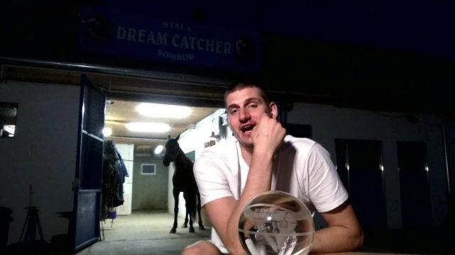 约基奇在马厩外展示MVP奖杯,调侃当自己又老又胖后,希望还能记得这个奖项。