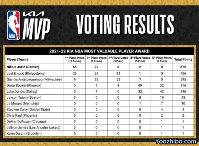 24直播网05月12日讯,NBA官方宣布,掘金中锋约基奇正式当选MVP。此前,ESPN已经提前爆料了这一消息。官方公布了MVP的票数分布情况,约基奇得到65张第一选票,27张第二选票,6张第三选票,2张第四选票,总分875分,恩比德总分706分,约基奇以169分的优势击败了大帝。字母哥595分,布克216分,东契奇146分,塔图姆43分,莫兰特10分,库里4分,保罗2分,德罗赞、詹姆斯、杜兰特各1分。