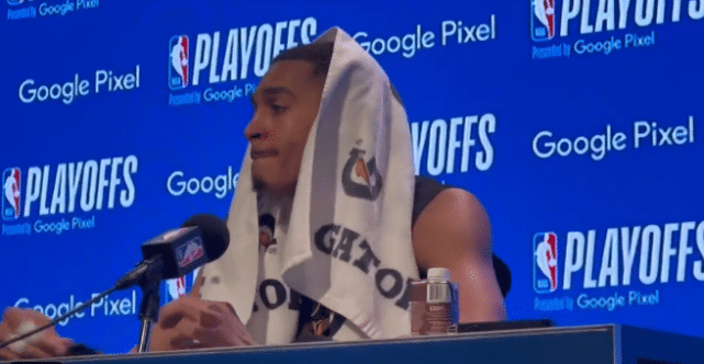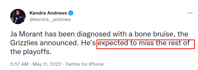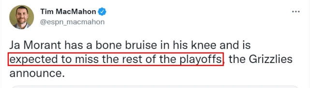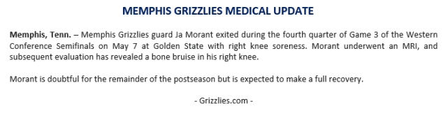 莫兰特在场边观看了双方G3的比赛,他并没有参加投篮训练,而且走路明显一瘸一拐。灰熊拖了很久才公布莫兰特的伤情,也引起不小的争议。NBA名记Tim MacMahon和Kendra Andrews都报道称,莫兰特预计赛季报销!