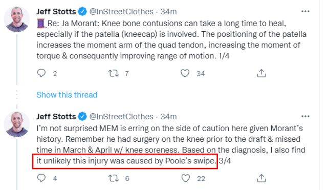 联盟知名伤病专家Jeff Stotts表示:膝盖骨挫伤可能需要很长时间才能康复,特别是当伤病涉及髌骨时……髌骨会接触过膝关节的多个区域,这种重复的骨头之间的接触,会延迟愈合过程,并延长恢复时间,考虑到莫兰特的膝盖伤病历史,我不惊讶于灰熊会非常谨慎。