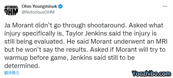 当被问及莫兰特今日是否会出战/尝试参与赛前热身时,詹金斯表示仍待确定。