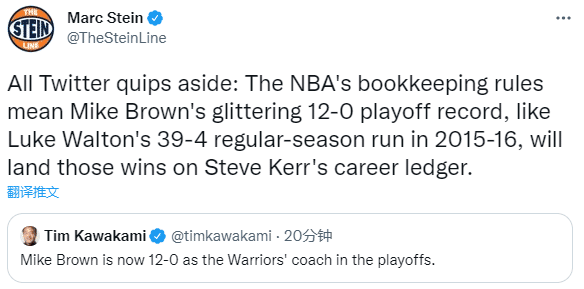 据名记Stein赛后报道:根据NBA 规则,迈克-布朗虽然在季后赛带领勇士取得了12胜0负的战绩,但就像卢克-沃顿在2015-16赛季带领球队取得39胜4负的常规赛一样,联盟最终将把这些胜利记在史蒂夫-科尔的职业生涯纪录上。