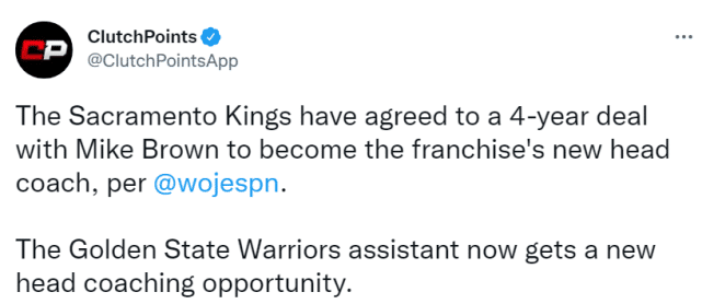 24直播网05月09日讯 ,据名记沃纳罗斯基报道,国王的新帅已经正式敲定,他们和迈克-布朗签约四年,这位在勇士效力6个赛季的功勋助教被成功挖走了。