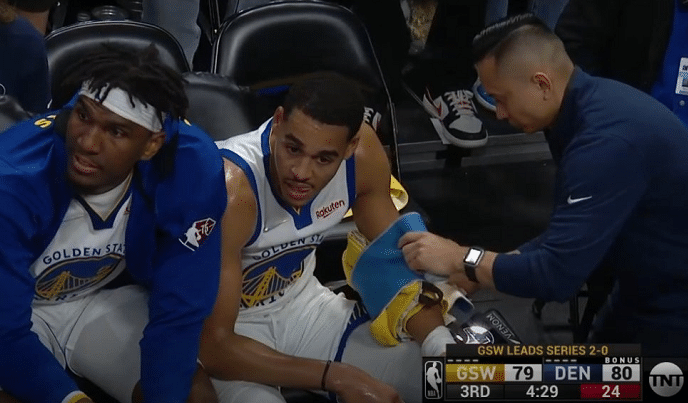 这是第三节进行到还剩下7分20秒的时候,戈登补篮得分,追梦格林倒地不起。慢动作显示,追梦格林是在防守回合时,踩到了队友克莱的脚,他扭伤了脚踝。之后被搀扶离场,不过好在追梦格林问题不大,他轻伤不下火线,暂停之后直接返回比赛带伤出战。