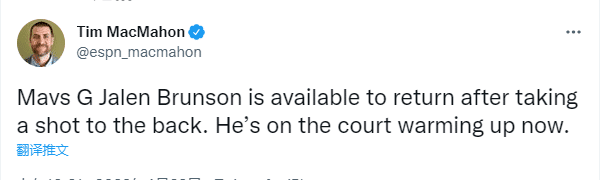 上半场布伦森上场14分钟9投6中拿到15分1篮板1助攻,独行侠68-51领先爵士17分;所幸布伦森的身体无碍,下半场早早上场进行热身,并且继续参加比赛。