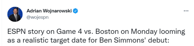 24直播网04月21日讯 ,ESPN名记沃纳罗斯基报道,消息人士告知,篮网球星本-西蒙斯通过这周的训练以及对未来几天的进展预期,已经将北京时间下周二(4月26日)的系列赛G4定为本赛季处子秀的现实目标。