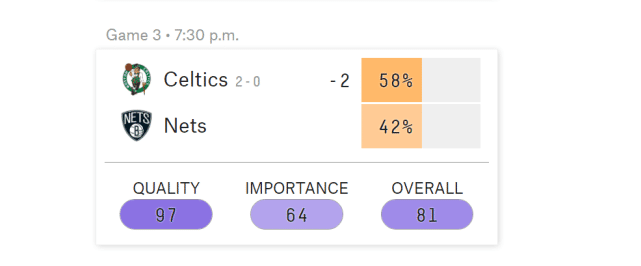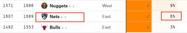 还是538数据网站,他们已经晒出了G3的概率预测。篮网虽然主场作战,获胜概率只有42%,依然是被看衰的一方。本赛季的常规赛,篮网主场20胜21负,客场24胜17负,他们是本赛季东部前十的球队里唯一一支主场胜率不过半的球队。