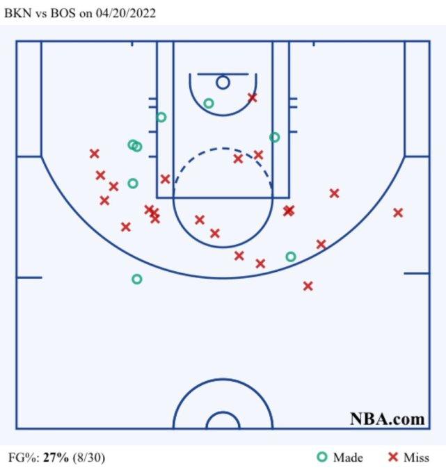 很快有美媒晒出了杜欧两人的投篮图,满眼的红X(表示不中)令人扎心。有媒体建议杜兰特和欧文减少中投,需要加强突破和三分。不过,从这两场比赛的情况来看,绿军确实针对杜兰特的防守很成功。