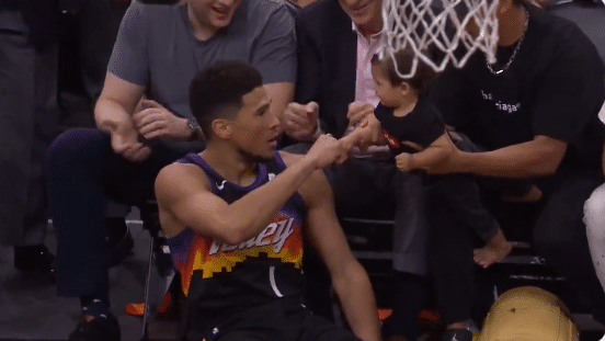 首节比赛,布克开场连得5分,克劳德2+1,太阳8-2领先,英格拉姆和CJ带队反扑并且反超比分,见状布克再次砍分,外线接连命中3记三分,更是投进不讲理压哨中投,翻身后仰太潇洒,第一节打满12分钟轰下16分,和小宝宝击拳一幕太暖心。