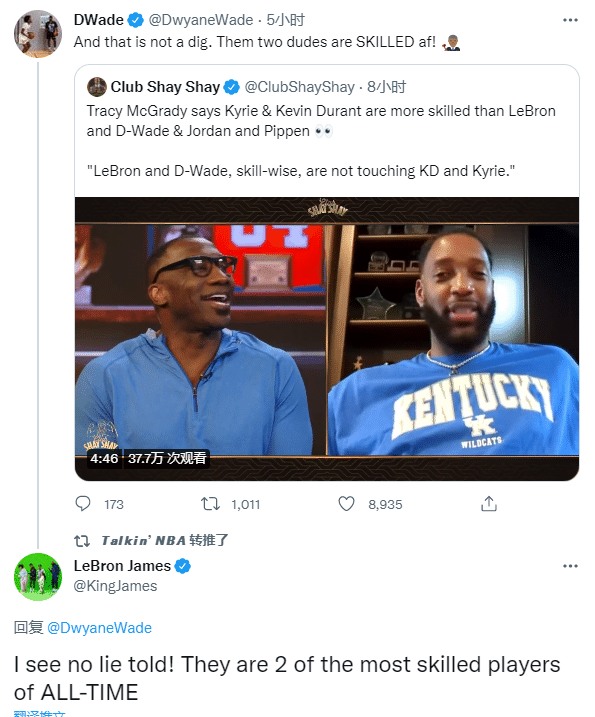 詹姆斯同样赞同麦迪的看法,发推回复韦德:这不是谎言,他俩是有史以来最具技巧的球员。