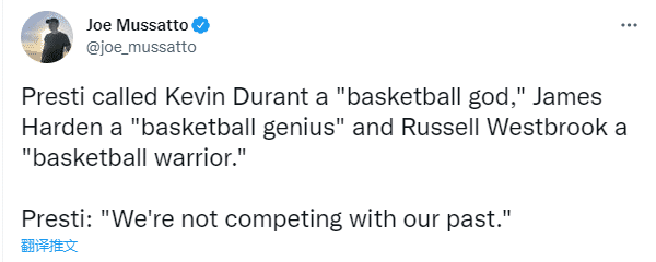 24直播网04月19日讯 ,雷霆总经理普雷斯蒂接受媒体采访,公开盛赞昔日的雷霆三少,直言:杜兰特是篮球之神,哈登是篮球天才,威少是篮球战士,还表示:我们不是在和自己的过去竞争。