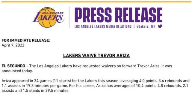湖人官方宣布裁掉前锋阿里扎,北京时间今天早上5点是球队裁掉到期合同球员的截止时间。湖人也赶在截止时间前裁掉了阿里扎。美媒报道称,湖人可以用这个名额转正一位年轻球员或者签下一位自由球员。