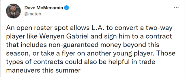 湖人为什么要裁掉阿里扎,腾出名额?名记Dave McMenamin报道称,腾出一个名额允许湖人转正像加布里埃尔这样的双向球员,并和他签订一份新合同。他们也可以选择用这个名额签约其他年轻人。这些合同都会对今年夏天的交易策略有所帮助。加布里埃尔在3月2日和湖人签了双向合同,赛季至今打了23场比赛,场均4.6分3.3篮板,投篮命中率46%,三分命中率26.9%,罚球命中率58.1%、