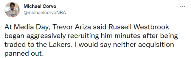 湖人记者Michael Corvo报道称,阿里扎曾在媒体日透露,威少被交易到湖人没多久,就第一时间招募自己加盟湖人。Corvo表示湖人的这两笔收购,都没有转换成赛场上的成功。