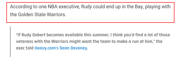 24直播网04月08日讯 ,据NBA记者Sean Deveney报道,一位NBA高管爆料称勇士有兴趣追求戈贝尔。维金斯和怀斯曼成为潜在的报价筹码,此前有报道称,独行侠也对戈贝尔很有兴趣。
