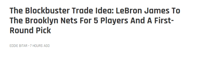 24直播网04月07日讯 湖人的2021-22赛季已经提前结束,詹姆斯的未来引起美媒和球迷的关注。北京时间4月7日,美媒Fadeaway World晒出了一笔用詹姆斯1换6的方案,认为这对本赛季陷入困境的湖人和篮网来说是双赢的方案。