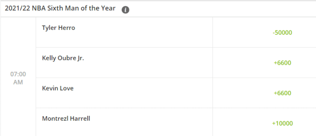 最佳第六人奖是五大奖项里悬念最小的,甚至可以说是已经没有悬念了。希罗(-50000)强势领跑,其余三位和他之间的差距极大。乌布雷(+6600)和乐福(+6600)并列第二,哈雷尔(+10000)排名第三。