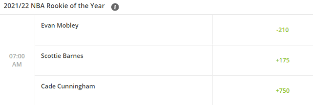 虽然火箭的榜眼格林最近状态火热, 但纵观整个赛季的表现,他还是没有进入最佳新人奖的赔率前三。目前最佳新人奖领跑的是骑士探花莫布利,他的赔率是-210,排名第二的是猛龙的4号秀巴恩斯(+175),位居第三的是活塞状元坎宁安(+750)。这样看来,莫布利和巴恩斯的希望最大。
