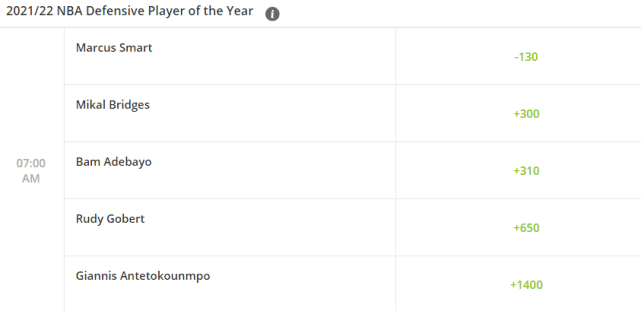 五名球员出现在最佳防守球员奖的赔率榜上,目前领跑的是绿军后卫斯马特(-130),排名第二的是太阳侧翼米卡尔-布里奇斯(+300),第三的是热火的阿德巴约(+310),和布里奇斯相差无几。爵士中锋戈贝尔(+650),看来难以第四次获此殊荣,字母哥(+1400)排名第五。