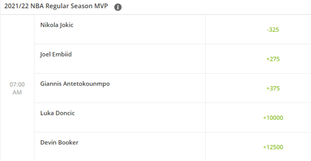 排名第二的是76人的恩比德,赔率+275,位居第三的是雄鹿的字母哥,赔率+375。今年的MVP应该就会在这三名球员中产生,毕竟,排在第四的东契奇(+10000)和第五的布克(+12500)赔率不在一个竞争级别了。