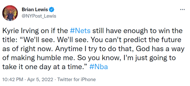当被问及健康的篮网能否拿下一个总冠军时,欧文给出了一个并不确定的答案。“让我们拭目以待,兄弟。”欧文说道,“我们身处现在,无法预知未来。任何时候当我试图探问未来,上帝都会以他的方式使我敬畏,让我谦卑。所以你知道,我就是过好当下的每一天(不去探问未来)。我只能走一步看一步,这是我一整个赛季一直强调的。打一场看一场,我不会去想如果我们赢了全部4场,如果我们3胜1负……那么我们的对手会是谁。我只是期待今天的比赛,希望我们能有一场精彩的表演。”