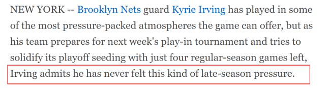 24直播网04月06日讯 生涯至今,欧文打过一些硬仗,但他的球队正在为附加赛做准备,并试图通过最后4场常规赛来获得更好的位置,这样的情况却是欧文不曾经历的。北京时间4月6日,欧文在训练后的采访中承认,自己目前在赛季末面临的压力,是前所未有的。