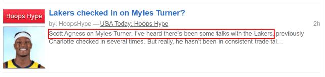 24直播网12月12日讯 ,据步行者随队记者Scott Agness在节目中透露,湖人和步行者进行过关于迈尔斯-特纳的交易谈话。