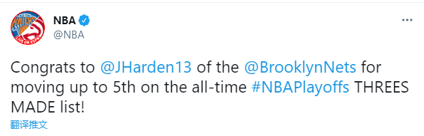 随着哈登首节投进两记三分,季后赛325记三分正式超越吉诺比利升到历史季后赛三分榜第五位,排在哈登前面的依次是库里(470记)、詹姆斯(422记)、雷阿伦(385记)和汤普森(374记)。