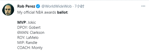 名记Rob Perez和Chris Kirschner也都把第一选票投给了约基奇,其中Rob Perez还公布了自己的其他投票结果——戈贝尔DPOY(年度最佳防守球员)、克拉克森最佳第六人、拉梅洛最佳新秀、兰德尔进步最快球员和蒙蒂-威廉姆斯最佳主教练。
