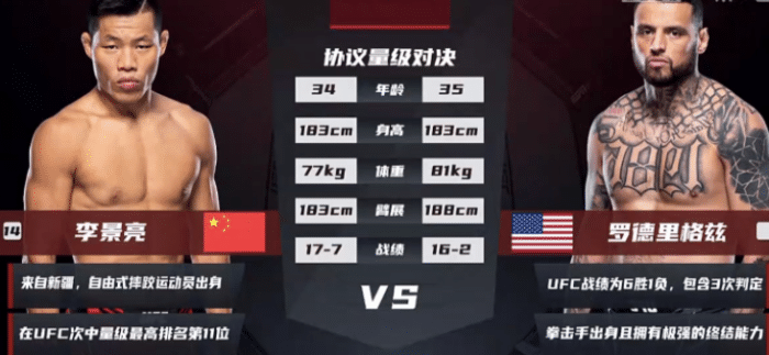 赛前:李景亮的对手临时更换,原本是“双魔对决”李景亮大战传奇弗格森,但因为奇马耶夫超重,所以对阵出现变化,参与战斗的人都留在比赛名单上,不过对手更换,李景亮的对手换成了比自己重8.5磅的罗德里格兹,体重层面,双方并不在一个档次,但李景亮还是接下了这场比赛,没有丝毫的抱怨。